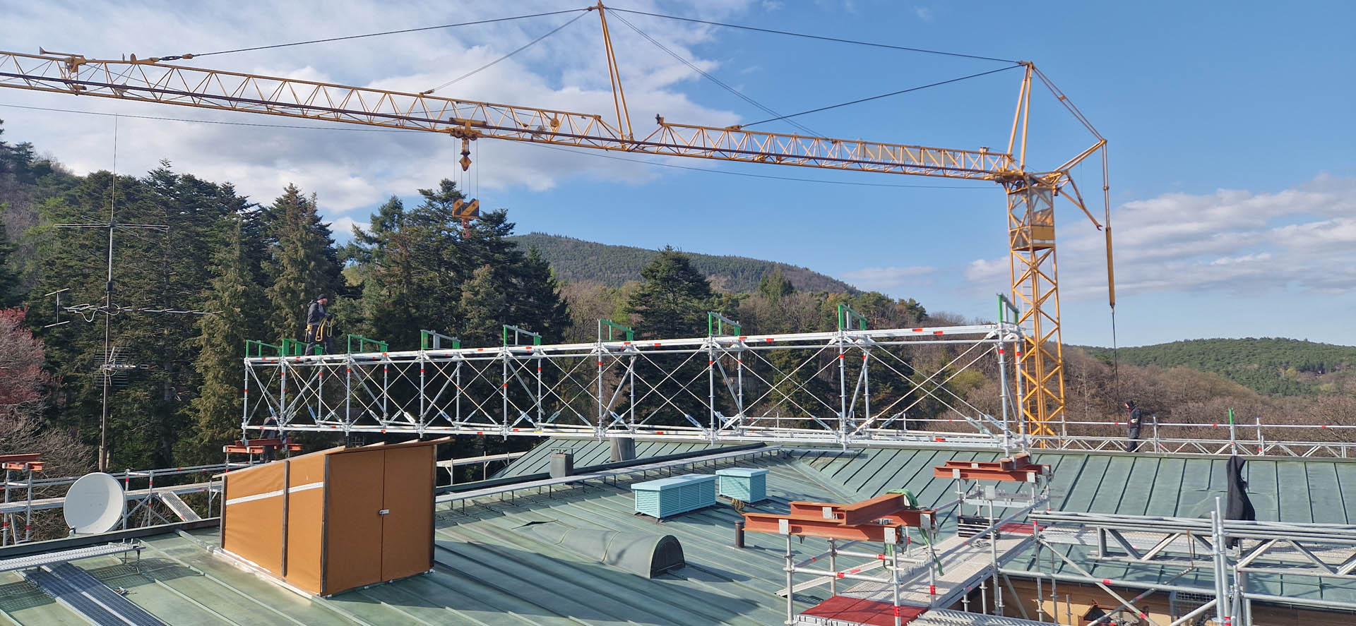 Hängegerüste werden von einer tragenden Struktur abgehängt und sind ideal für Arbeiten an hohen Gebäuden.